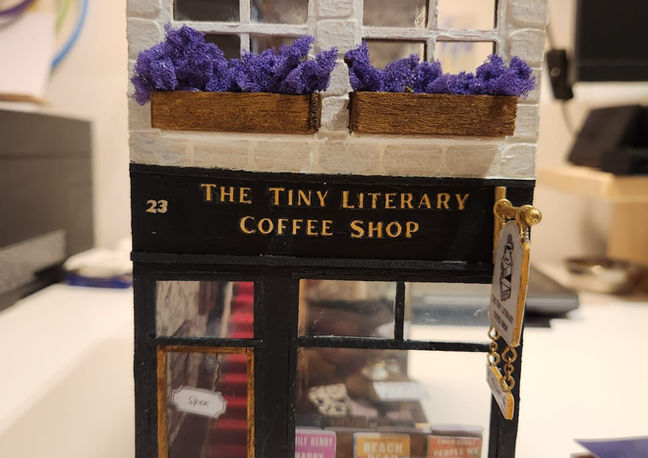 Eu fiz esse book nook como presente de aniversário para a minha irmã, que, assim como eu, sonha em um dia abrir um café que também seja uma livraria.